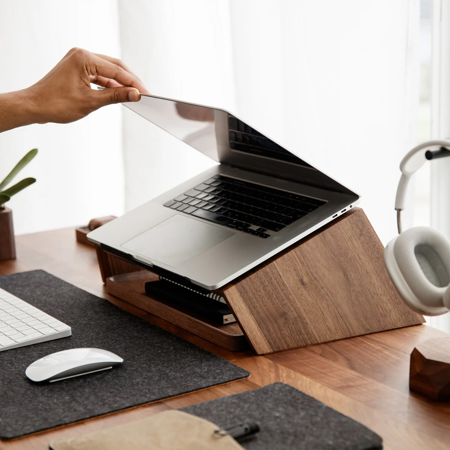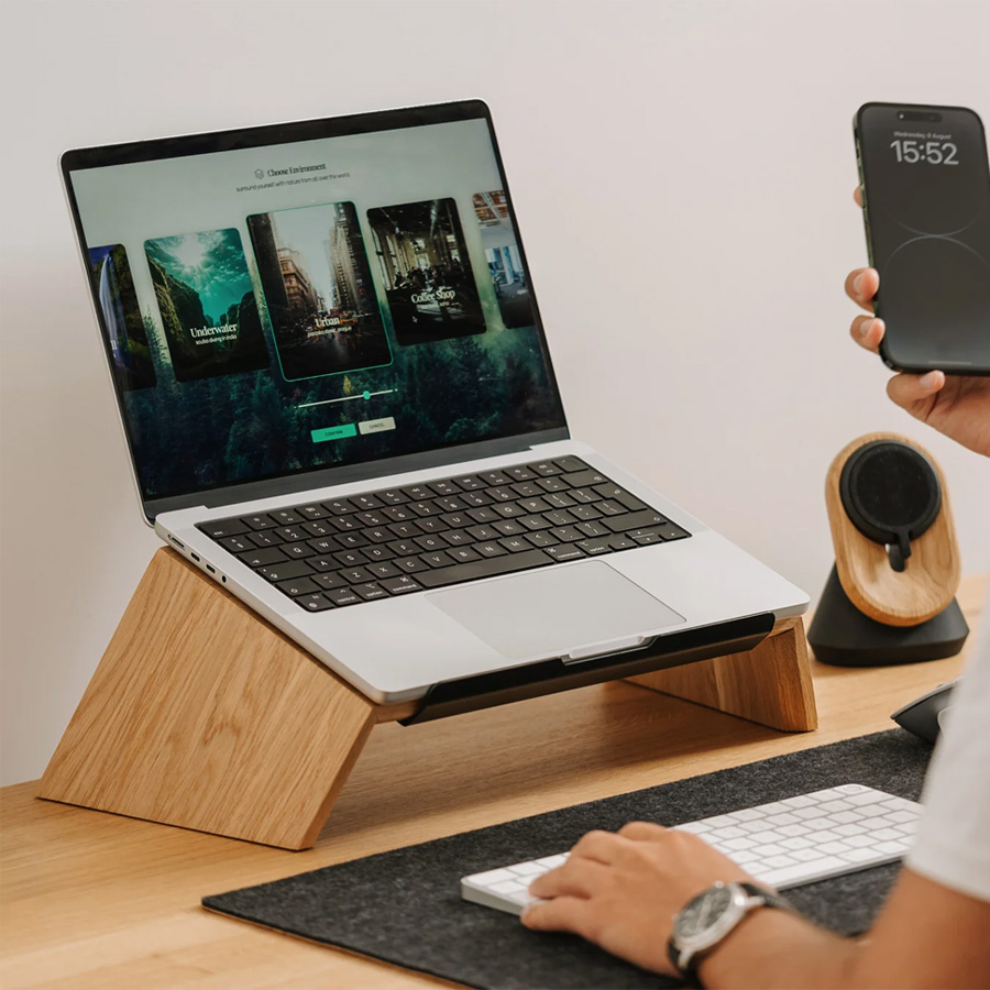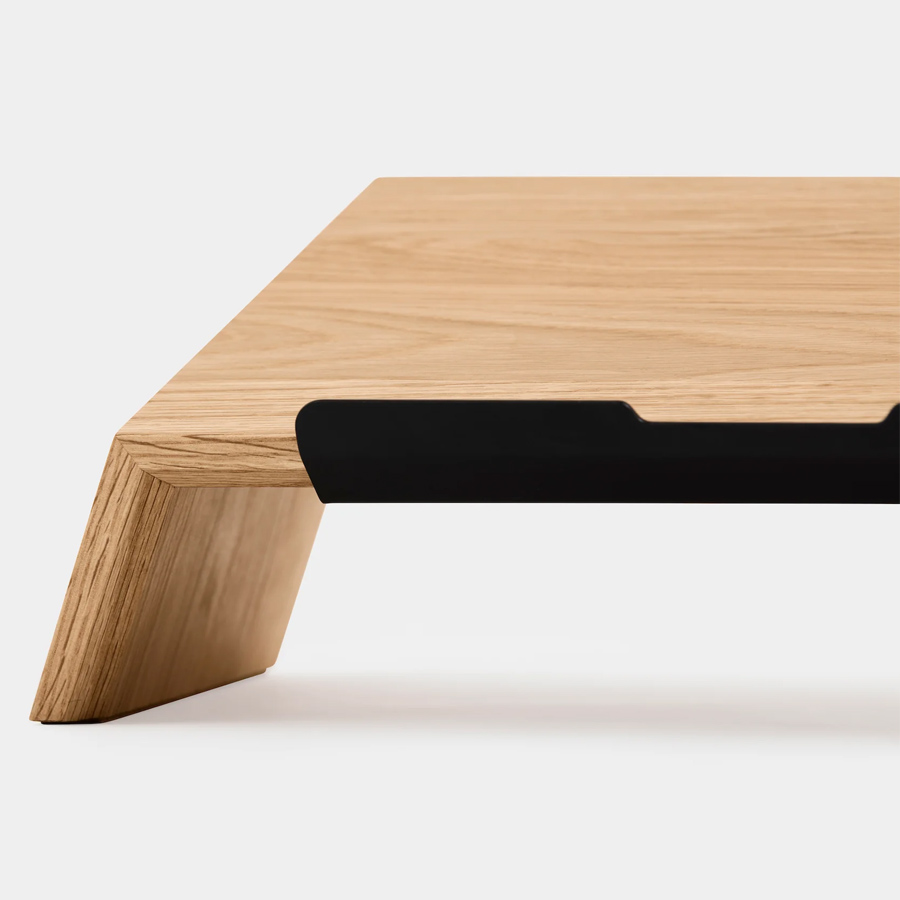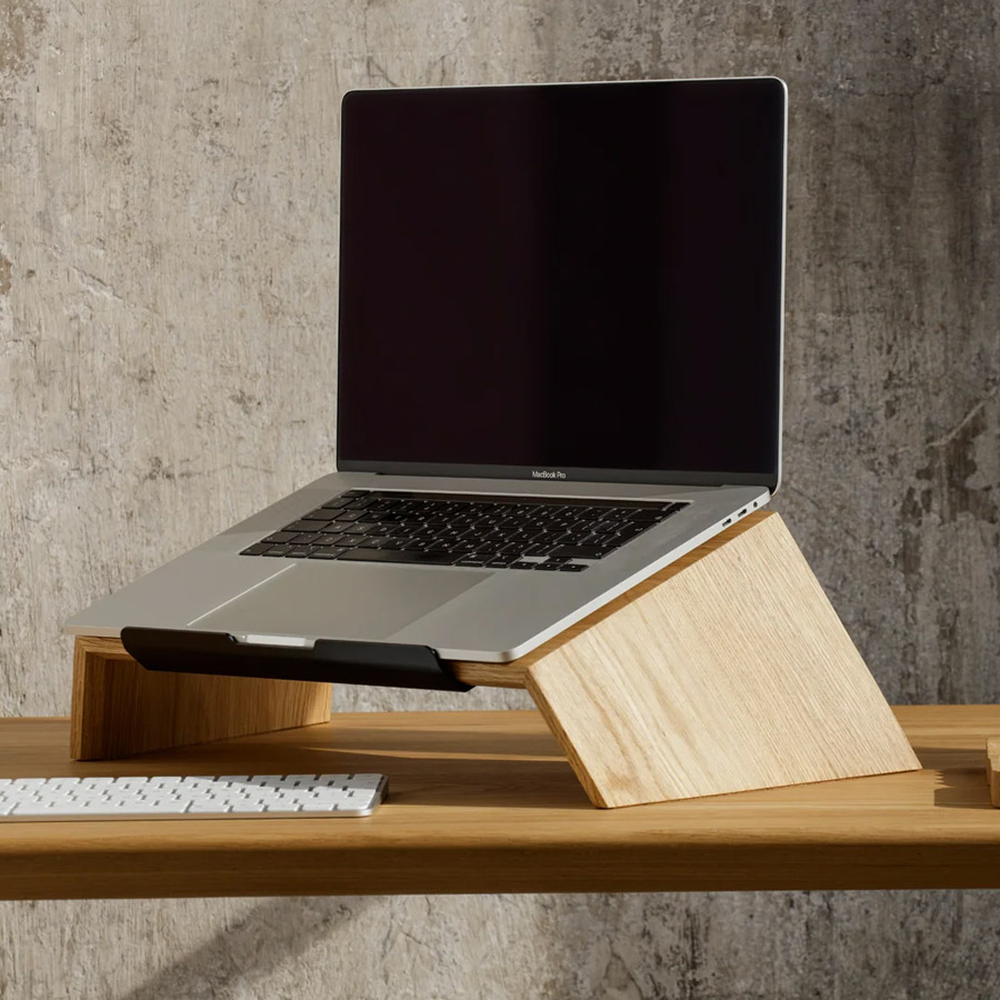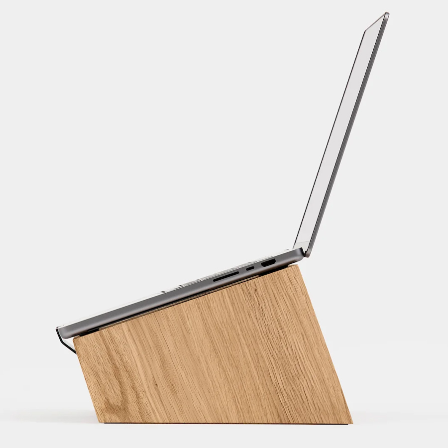 Laptop Stand – ein Laptopständer aus Holz, der den Komfort und die Ergonomie an ihrem Arbeitsplatz erheblich erhöht. Die Halterung erhöht das Gerät um 15 cm bis auf eine ergonomische Position auf Augenhöhe, so dass Sie gerade sitzen und das Risiko von Nackenschmerzen, Augenschmerzen und Schmerzen im Bereich der unteren Wirbelsäule reduzieren können. Dank der erhöhten Konstruktion ist es möglich, kleine Gegenstände unter dem Ständer aufzubewahren.