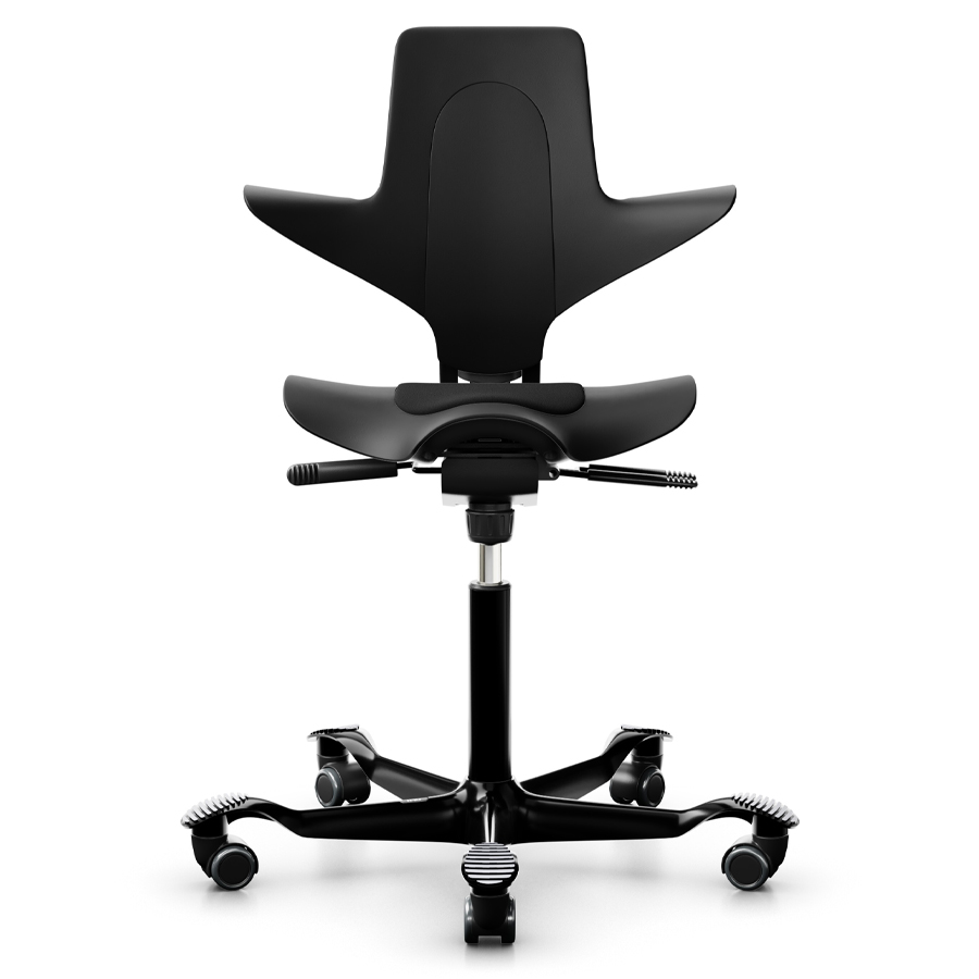 Hier bieten wir Ihnen das Modell 8010 in schwarz ohne Fußring und gebremsten Rollen an. Perfekt also für Ihren Steharbeitsplatz. Hier wurde die hohe Gasfeder verbaut - also 265 mm Höhenintervall mit einem Verstellbereich der Sitzhöhe von 55,5 cm bis 80,5 cm. Diese empfehlen wir vor allem für eine Körpergröße ab 1,80 m, wenn der Stuhl an einem höheren Tresen/Steh-Sitzarbeitsplatz eingesetzt wird. Der Capisco wurde für seine besonderen Eigenschaften und sein außergewöhnliches Design mit einer Vielzahl an Preisen ausgezeichnet.