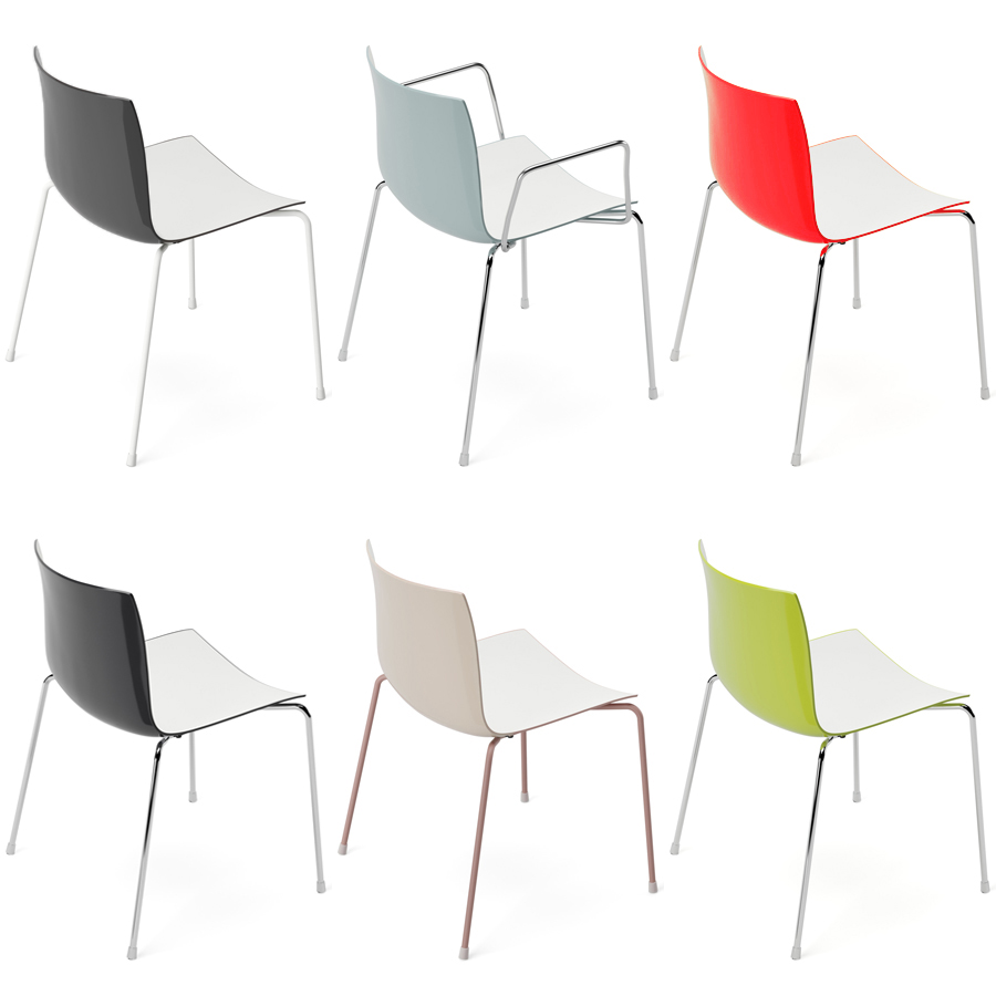 Die Arper Catifa-Stühle mit Kufengestell, Sternfuß und Vierfuß-Gestell sind optional mit Armlehnen in Gestellfarbe erhältlich.