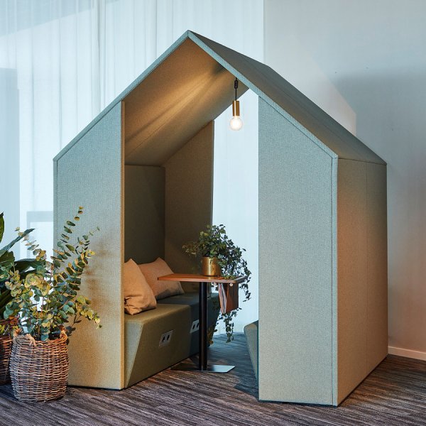 Die einfachen und geraden Linien der Serie The Hut sind inspiriert vom Kultspiel Monopoly und seinen Symbolen, die dem beliebten und zweckmäßigen „Raum-im- Raum“-Konzept eine zeitlose Form verleihen. Die Hütten der Reihe können für verschiedenste Zwecke genutzt werden: als Einzelarbeitsplatz, als kleiner Meeting-Raum zum Sitzen und Stehen oder als Entspannungszone in Kombination mit dem The Hut Sofa.