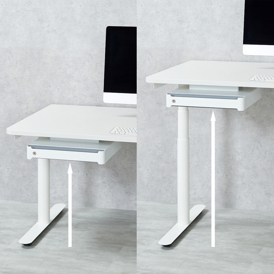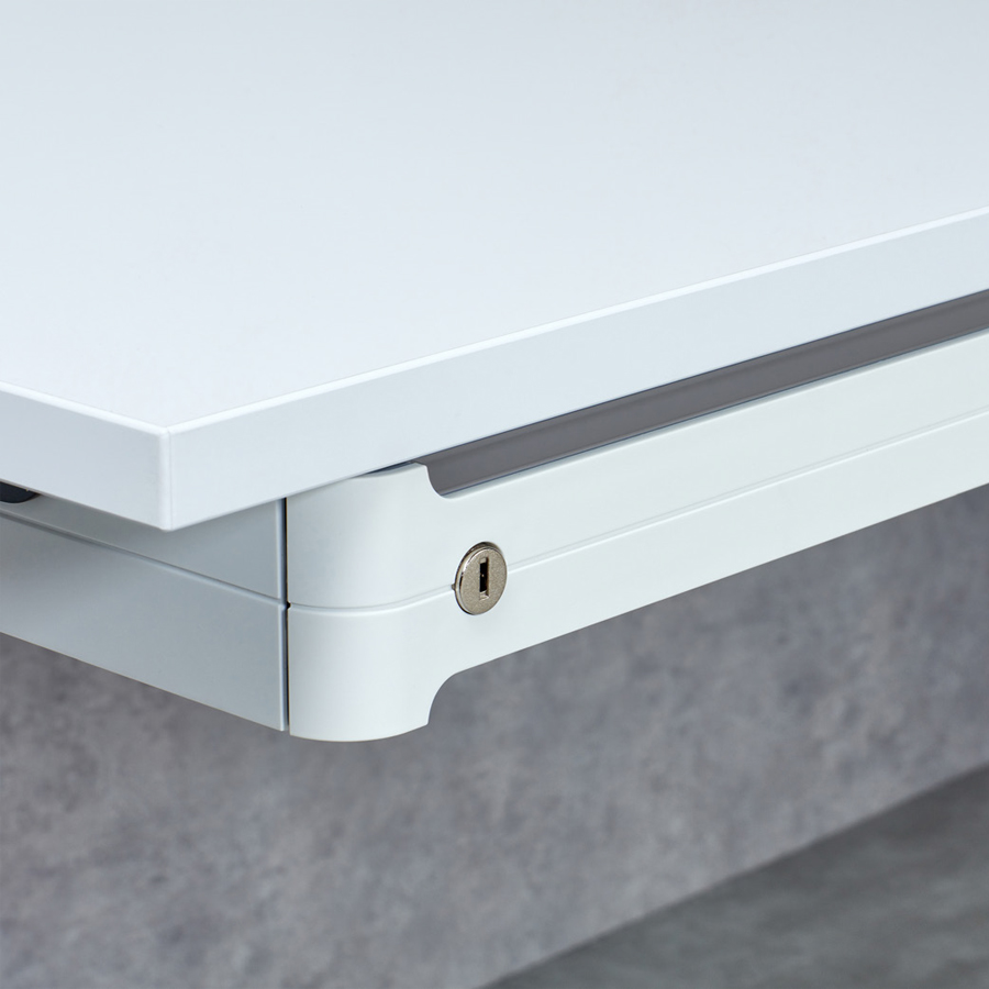 Der höhenverstellbare Schreibtisch kann optional ebenfalls mit einer Unterbauschublade aus Kunststoff ausgestattet werden. Die Schublade ist weiß und verfügt über einen gedämpften Vollauszug mit "Soft Stopp", der abschließbar ist. Außen ist die Schublade 42 cm lang, 41 cm tief und 7 cm hoch. Im Inneren befindet sich ein Anti-Rutsch-Boden in Grau.