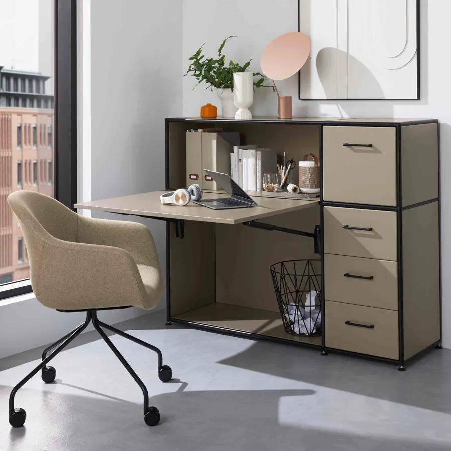 Um diese Stabilität und Flexibilität sowie eine moderne Ästhetik zu gewährleisten, besteht der Rahmen aus geschlossenen Systemknoten und schwarz lackierten Stahlrohren. Die Kombination aus melaminbeschichtetem Trägermaterial und Metall ermöglicht ein nahezu lautloses Schließen von Türen, Klappen und Schubladen und ebenso einen schnellen Zugriff auf Ihre Unterlagen und Ordner.