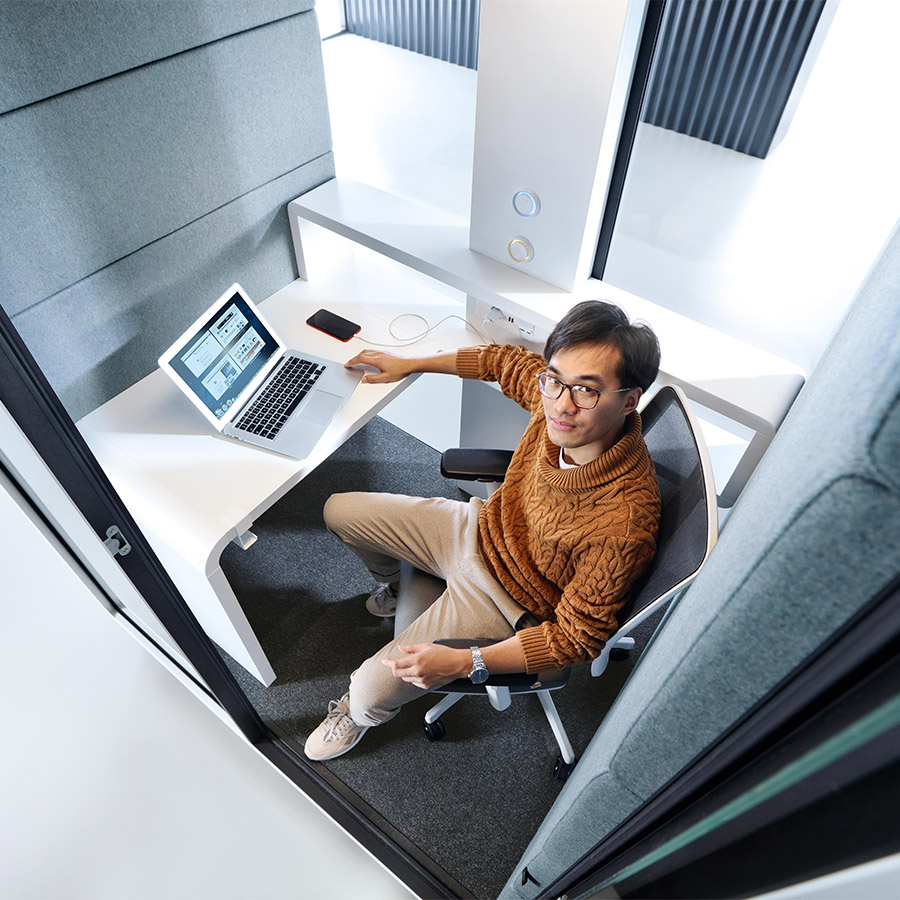 Hushwork ist eine schallgedämmte Kabine für die Einzelarbeit. Sie ist mit komfortverbessernden Eigenschaften für die Einzelarbeit ausgestattet, selbst wenn diese über einen längeren Zeitraum stattfindet. Belüftung und Beleuchtung sind einfach einzustellen und ermöglichen eine Anpassung der Arbeitsumgebung an die individuellen Bedürfnisse und Vorlieben. Ein klassischer Schreibtisch bietet einen komfortablen Computer-Arbeitsplatz.