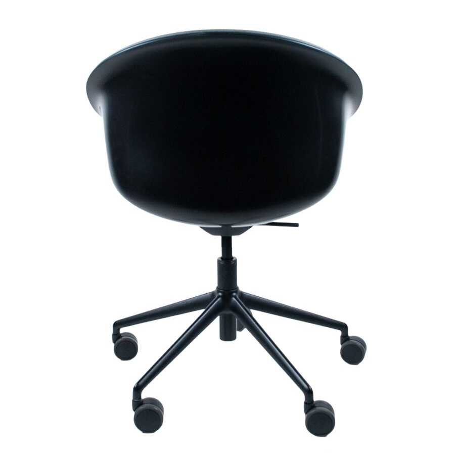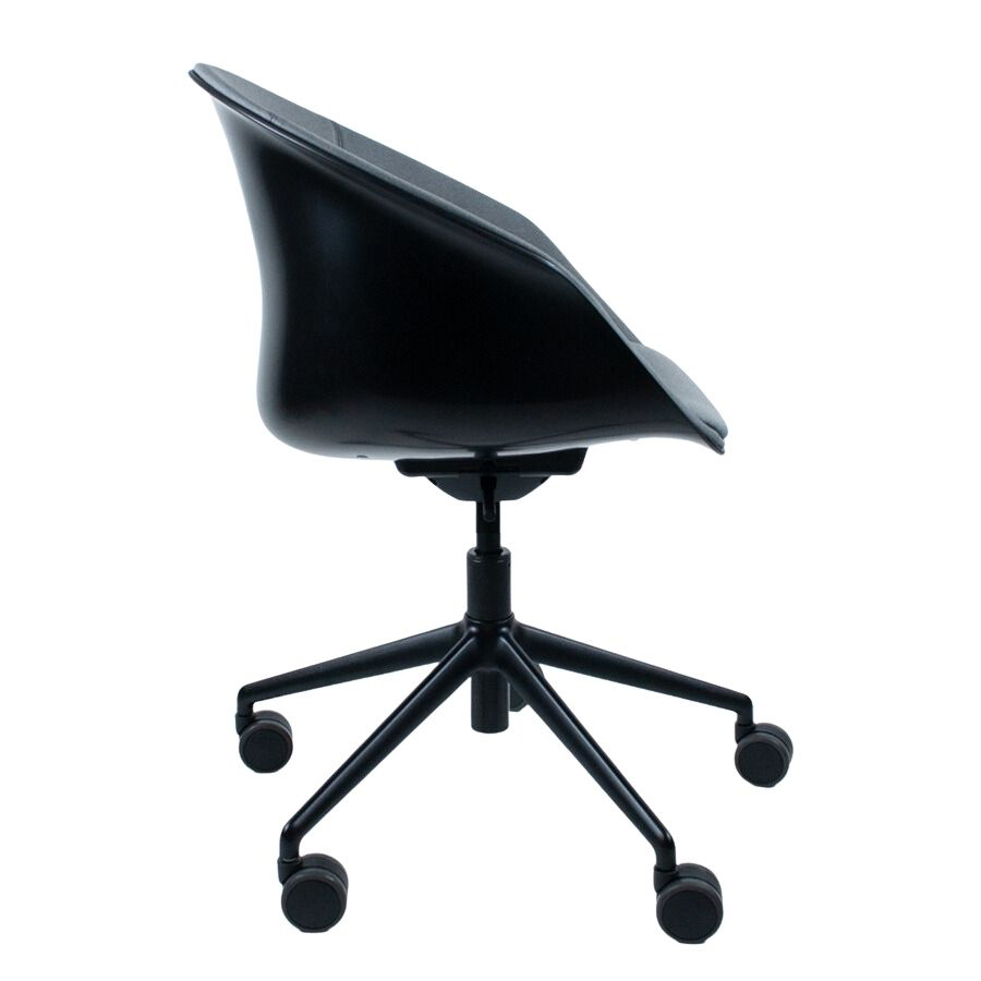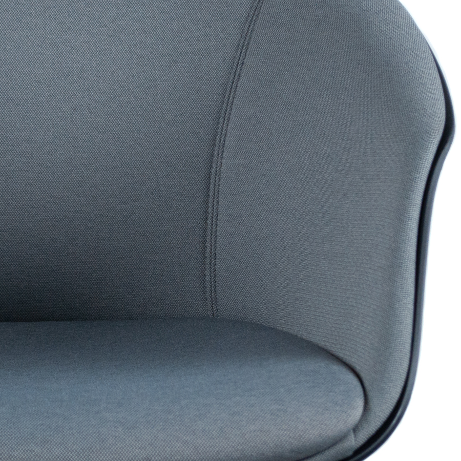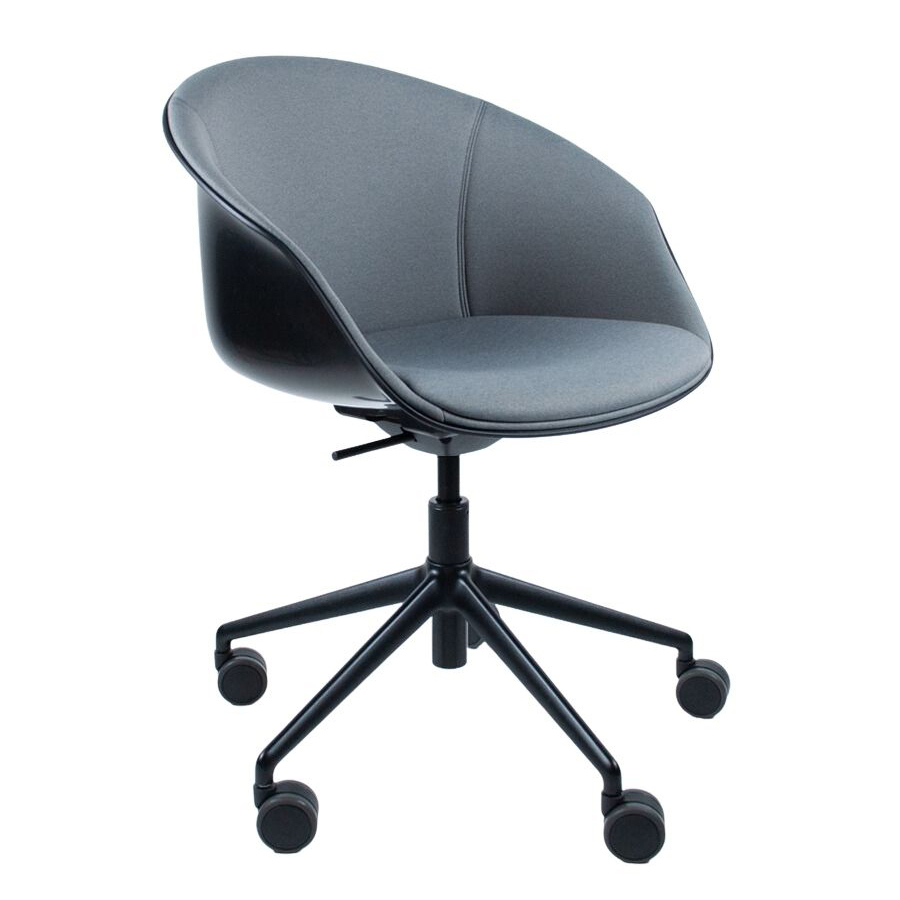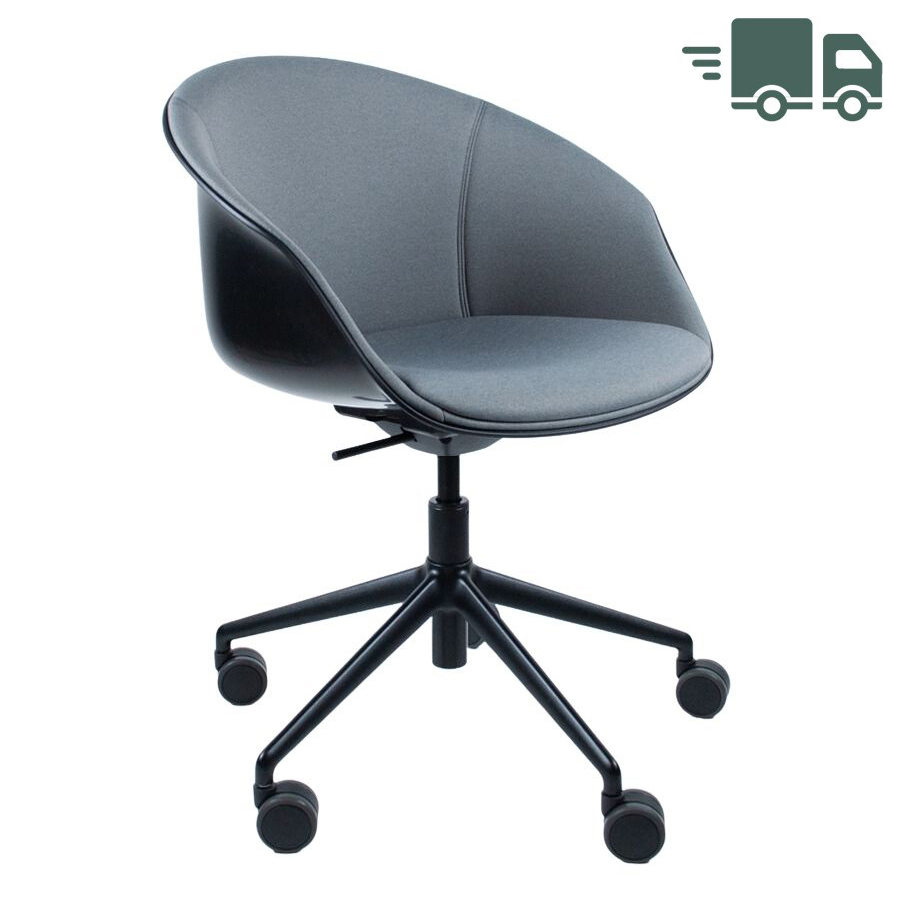 Die Sitz- und Rückenfläche ist gepolstert - Schaumstärke 2 cm. Die Kunststoffschale ist ergonomisch geformt, aber bei diesem Modell nicht gepolstert. Bei dieser Ausführung kommt der Bezugsstoff Era in Quarzgrau (100% Polyester) zum Einsatz. Zudem sind weiche Rollen für harte Böden montiert.